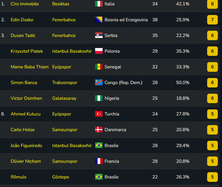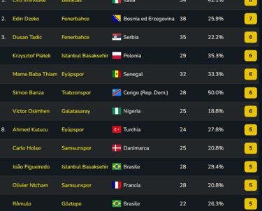 Qualcuno guardandosi la Classifica marcatori della Superlyg Turca potrebbe ritrovarsi una lacrima sul viso.